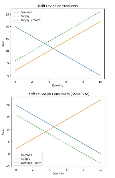 In short, the tariff pushes the equilibrium over by an amount equal to the value of the tariff, whether imposed on consumers or producers. This imposes deadweight loss proportional to the value of the tariff. If a tariff of 50 cents was imposed, the deadweight loss would be all the interactions where consumers would have profited by less than 50 cents. Those would have benefitted both parties, and yet they just don’t happen.