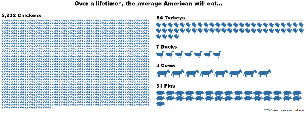 By changing which animals you eat, you can vastly diminish the amount of animal suffering you cause. Different animals cause vastly different amounts of animal suffering. Chickens are much smaller than cows, so over a lifetime, the average person eats thousands of chickens and just a few cows. Avoiding chicken—especially factory-farmed chicken—and eggs are the most important.