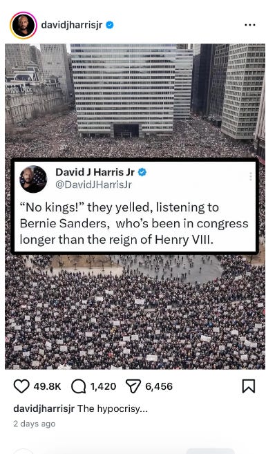 You wonder: did David Harris Jr. think, as he was typing this, that this was some bulletproof, unassailable point that people on the other side would have no answer to? That Bernie Sanders differs from a king in no important respects? Did he think that if someone on the other side was presented with this hypocrisy, they would throw up their hands, cry “my worldview is in fundamental tension,” and dissolve like a vampire before the light of the sun. My guess is that he did not give this comment much thought. It was simply a convenient piece of political feces to fling vaguely in the direction of the other side. It’s basically emoting—like waving a little flag and saying “boo! Democrats.”