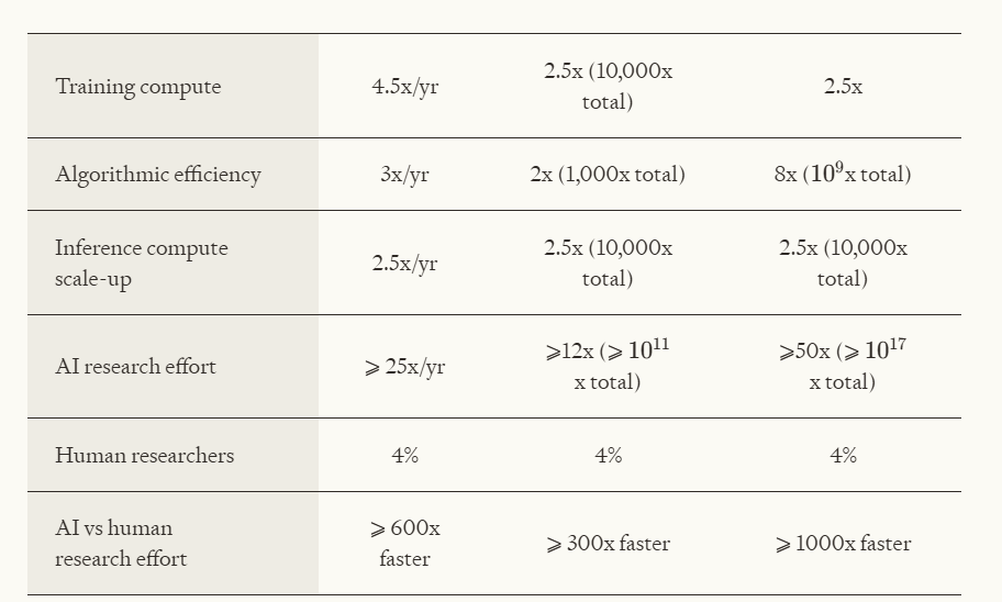 The authors write “Putting this all together, we can conclude that even if current rates of AI progress slow by a factor of 100x compared to current trends, total cognitive research labour (the combined efforts from humans and AI) will still grow far more rapidly than before.”