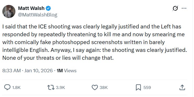 The left did not respond to Matt Walsh’s claims about the Renee Good shooting by threatening to kill him. The left did not have a planned and organized response. Instead, a small number of unhinged people on Twitter responded that way. A more common response was to explain why he was wrong, and a more common response than that was to ignore him.