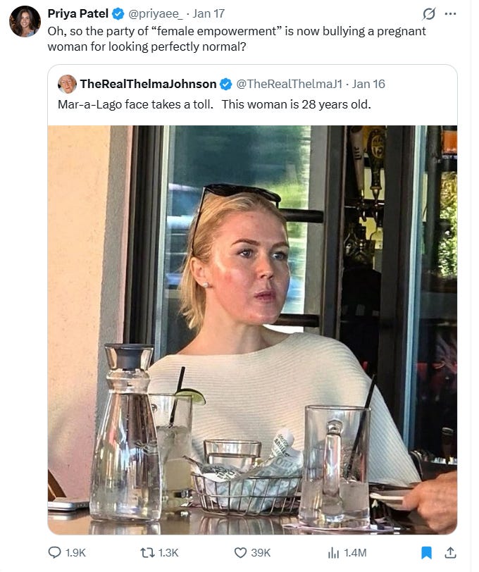 Similarly, the Democratic party did not make fun of the way Karoline Leavitt looked. Instead, one person did, and some other people liked the Tweet expressing that sentiment. I am a Democrat. I care about shrimp welfare. This does not mean that the Democratic party supports shrimp welfare!